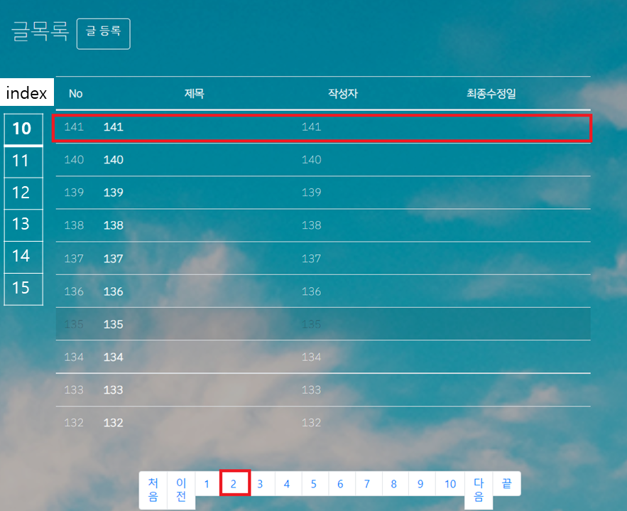 만약 게시글 페이지 URL이 http://localhost:8080/posts-list일때 2page의 No. 141 게시글이 보고 싶다면 첫번째 block에 있는 3버튼을 눌렀을 것이고 이동된 브라우저의 URL이 다음과 같을겁니다.