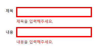 위의 사진을 보면 제목과 내용 밑에 검증 실패가 되어 출력된 오류메세지를 볼 수 있는데 위에서 설명한 것처럼 필드별로 확인하여 이렇게 필드별로 BindingResult에 담긴 검증 실패 메세지를 직접 Model에 담아 View에 전달하여 View에서 직접 내가 원하는 메세지로 출력할 수 있는 @ModelAttribute와는 달리 @RequestBody는 API요청을 다루기에 조금 복잡한 과정을 거쳐야합니다. 원래라면 BasicErrorController 등 따로 에러 처리에 대한 코드를 정의해두어야 하는 과정 등이 있지만 결과적으로 실무에서 제일 많이 쓰이는 방법은 @ExceptionHandler와 @ControllerAdvice를 이용하는 것입니다.