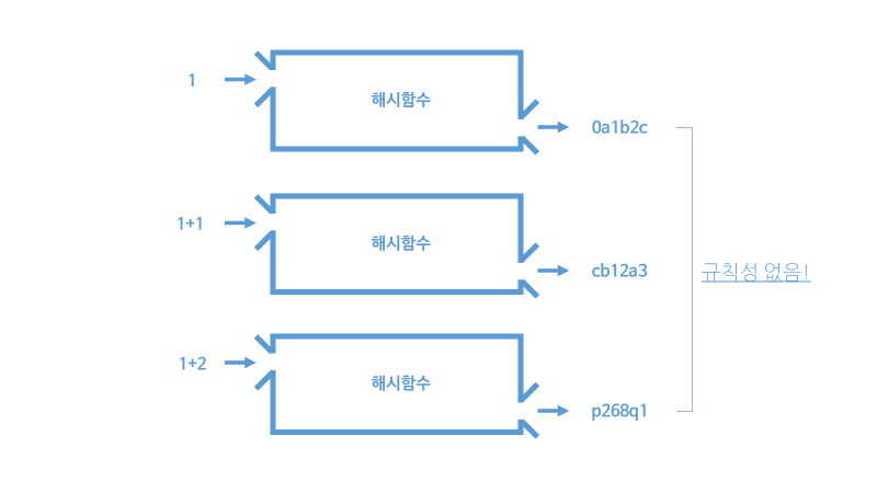 해시 함수란 x에 어떤 임의의 값을 넣어도 y는 고정된 길이를 가지는 값이 나오는 비가역적인 단방향 함수를 의미하며