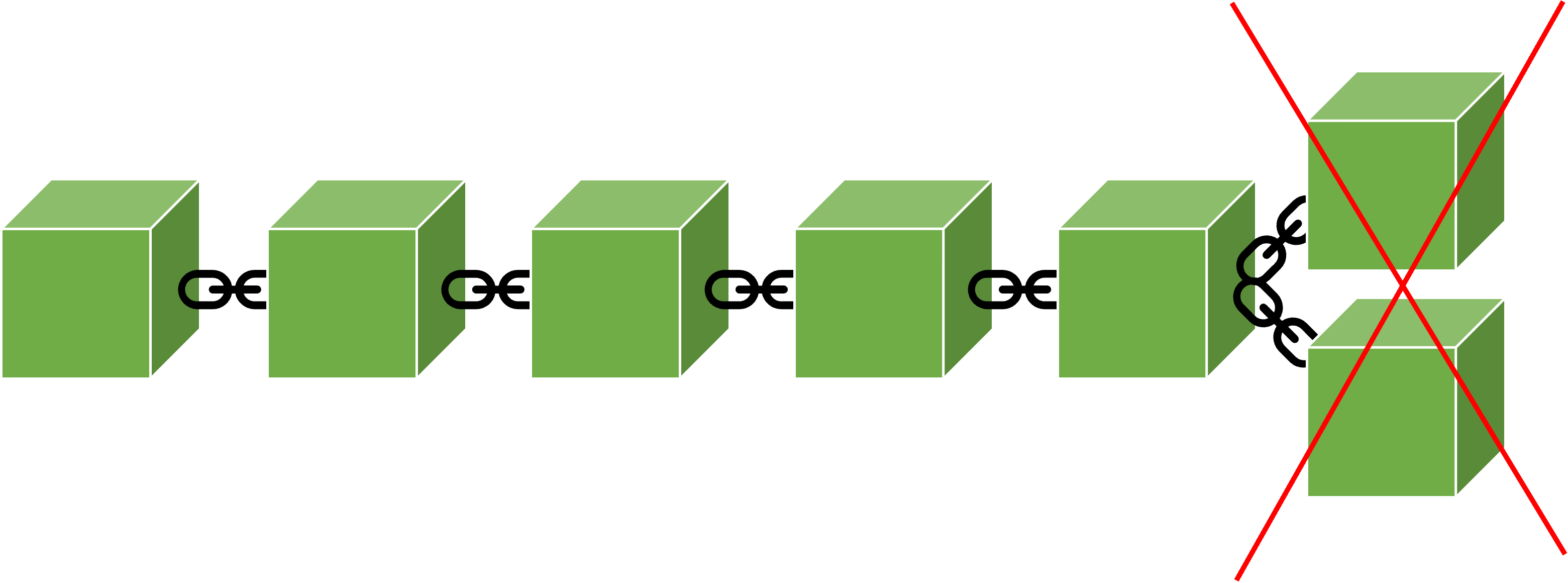 이 체인에서 block은 한 줄로 쭉 이어집니다. 또한 block은 하나씩 생성됩니다. 이 뻔해보이는 성질들은 블록체인의 중요한 특성 중 하나인 chain의 유일성을 보장합니다. 이 유일한 체인은 정격 체인이라 불리며 체인이 중간에 둘로 갈라지는 순간 체인의 유일성이 깨지기 때문에 이는 금지됩니다. 뒤에서 소개하겠지만 이런 경우 갈라진 분기에서 분리된 체인은 그 순간 개별의 개체가 됩니다. 예를 들어 깃의 Repo에 branch가 두개로 갈라지는 순간 각 branch는 각각의 Repo가 된다고 이해하면 편합니다.
