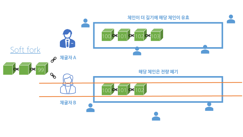아까처럼 A와 B가 동시에 100번째 블록을 생성했다고 합시다. 체인이 두 개로 갈라질 수 없기에 두 사람을 모두 인정할 수 없으니 이 때 사람들의 의견은 100번째 블록을 생성한 사람이 A인지 B인지 둘로 갈립니다. 이 과정은 포크라 불리며 이 경우 아직 의견이 분리된 정도고 실제로 체인이 분리된 것은 아니기에 소프트 포크라 합니다. 소프트 포크가 된 두개의 체인은 그대로 채굴 과정을 이어갑니다. 이 때 일정 시간이 흘렀을때 A가 포함된 체인의 블록 수가 B가 포함된 체인보다 많다면 시스템은 과감하게 B가 포함된 체인의 유효성을 인정하지 않고 소프트 포크된 시점부터 채굴 과정이 전량 폐기됩니다.