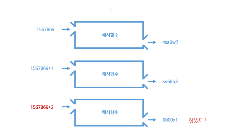 그런데 누군가 이 아무런 규칙성을 띠지 않는 y의 6자리 중 앞 4자리를 0으로 만드는 x값을 찾으면 상품을 준다고합니다. 예를 들어 '0000xx' 같은 값 말이죠. 인간은 이 문제를 혼자 힘으로 풀기 힘듭니다. 어떻게 사람의 머리로 랜덤으로 출력되는 y을 가지고 x를 찾을 수 있겠어요. 하지만 컴퓨터라면 충분히 가능합니다. 어떻게요? 나올때까지 노가다하면 됩니다.