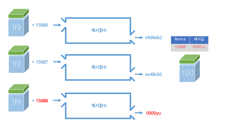 넌스를 변경하다 비츠와 일치하는 해시값을 발견하게 되면 그때의 정답 넌스값과 정답 해시값이 새로 생기는 100번째 블럭의 헤더에 기록되며 체인이 이어지기 위해 이전 블록의 해시값 역시도 기록되게 됩니다.