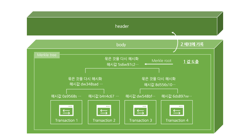 이 블록에서 한 트랜잭션이라도 임의로 변경되는 경우 머클루트가 변경되기 때문에 보안이 유지되며 헤더에 저장되는 머클루트 값은 고작 32byte에 불과하기에 참여자들은 모든 거래내역을 조회할 필요 없이 이 작은 값만 알면 필요한 정보를 블록에서 가져올 수 있기 때문에 접근성이 매우 높아집니다.