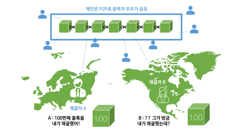 채굴 역시 하나의 체인을 P2P로 각 노드들(체인 참여자들)이 공유합니다. 그런데 채굴은 전세계에서 이루어지는데 지구 반대편에 있는 A, B가 동시에 100번째 블록을 채굴했을 때 과연 그 체인에는 어떤 블록이 기록되어야 정당한가요? 중앙 서버에 먼저 채굴했다는 통신이 도착한 쪽? 아니 근데 중앙 서버란게 없지 않나요?