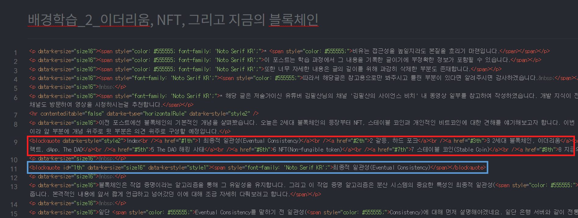 요소 1 : [<blockquote ... 문장 삭제] <span style="font-family: 'Noto Serif KR';">타이틀1 ~ 타이틀 2 이전 내용