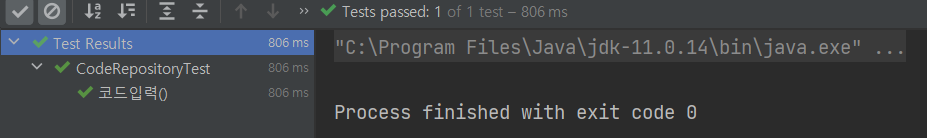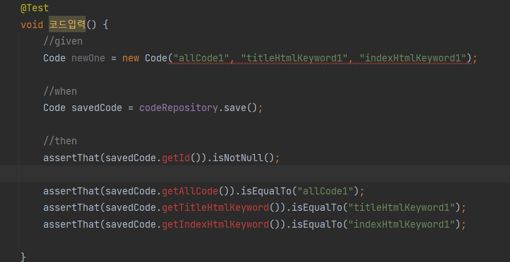 다시 CodeRepositoryTest로 돌아가서 이제 본격적인 테스트 메서드를 작성합니다.