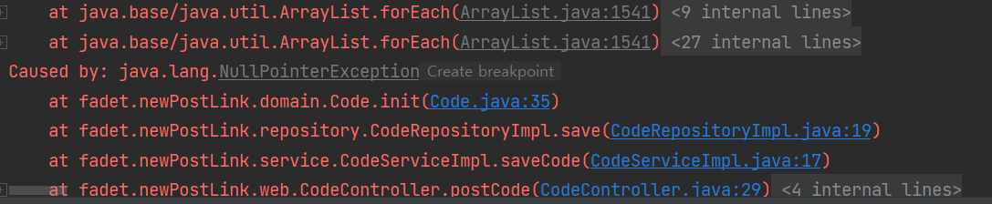 이 로그를 읽어보면 대략 도메인인 Code 객체가 생성되는 과정에서 포함된 초기화 메서드에 오류가 발생했음을 알 수 있습니다.