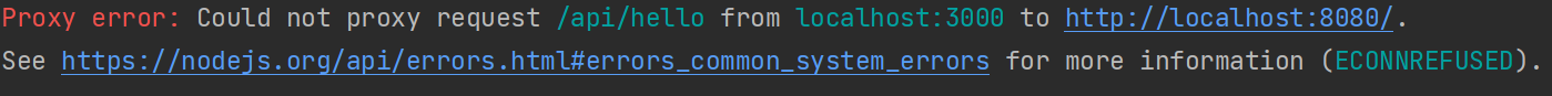 그리고 반드시 클라이언트와 서버 둘다 켜줘야 합니다. 만약 클라이언트만 키시면 실행은 되어도 다음과 같은 프록시 에러가 뜨면서 3000포트의 백엔드에서 가져온 데이터입니다 뒤에 Hello, world!가 안나올겁니다.