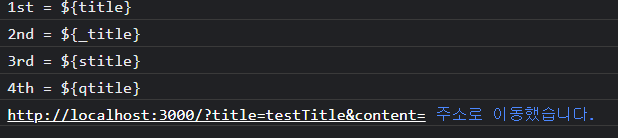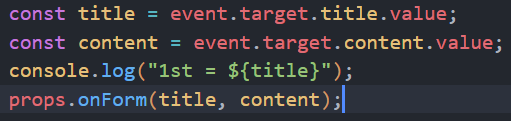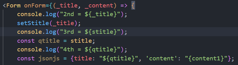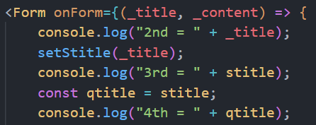 제가 내린 1번의 결론은 그냥 변수 렌더링 자체가 안된다는 것이었습니다. 그래서 2번 과정은 진행합니다. 2번은 제가 리액트를 그렇게 잘 하지 않기때문에 혹시 'state는 리터럴로 처리가 안되나?'나 '변수명이 서로 충돌하는건가?'라는 생각에 이르게 됩니다. 그래서 state인 title을 담는 임시 변수들을 생성합니다. 위에 stitle이니 qtitle이 다 그런 변수들입니다. 또 param인 title은 _title로 바꿔봅니다.