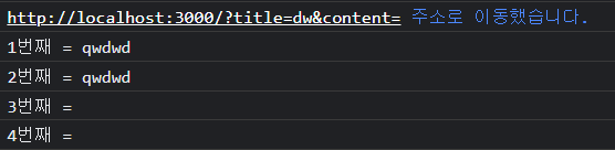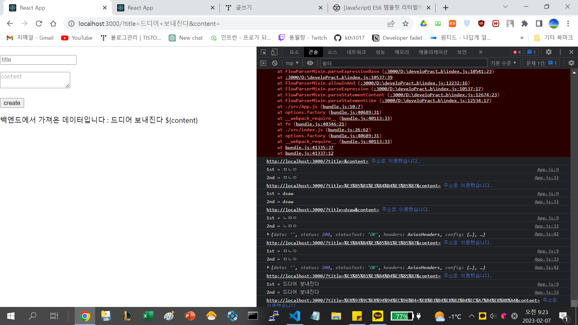 1번으로 어디서 문제가 발생했는지 로그를 출력해보기로 했습니다. 그래서 처음 데이터를 보내는 과정인 App.js에 로그를 찍고(중간에 stitle이니 qtitle이니 하는건 바로 다음에 설명)