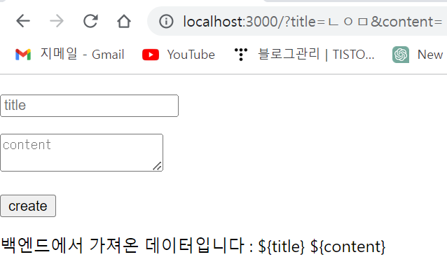 당연히 문제가 있는걸 바로 알 수 있죠. 변수가 렌더링되지 않고 텍스트 그 자체로 나왔잖아요? 기존에 템플릿들을 쓰신 분이라면 템플릿 리터럴을 아실겁니다. javascript는 es6 문법을 따라 작성할 수 있는데 이거 너무 기초적인거라 모르시면 refer 참고해주시길 바랍니다. 하여튼 es6는 리터럴 사용할 때 ""같은 텍스트 안에 변수를 넣으려면 ${변수}로 넣습니다. 기존에 자바 쓰셨던 분이라면 %d 이거 아실텐데 그거랑 똑같습니다.