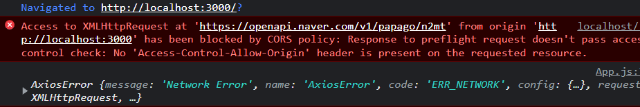 이러면 서버가 아닌 클라이언트에서 파파고 번역이 이루어진 채로 서버와 통신하므로 상대적으로 가벼운 번역 API를 클라이언트에서 처리할 수 있고 전체적으로 로직이 한 단계 줄게 됩니다. 그래서 App.js에 파파고 API 요청을 보내는 코드를 작성하여 응답을 테스트했습니다.