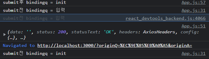 이 로그를 본 후 드는 바로 든 생각은 'state가 비동기 처리되서 값이 자꾸 이상하게 돌아가나?'였습니다만 제 지식으론 아무리 state가 비동기 처리된다해도 한 컴포넌트 내에서 두 개 이상의 state를 사용한 것도 아니고 그게 가능한지 의문이었습니다. 하지만 이 때까진 잘 몰랐기에 그게 문제인 줄 알고 state와 변수도 같이 사용해보고 sync한 처리를 위해 useEffect까지 사용했지만 전혀 해결되지 않았습니다. 결국 axios 문젠가해서 axios 문서도 다시 읽어봤고 submit후 값이 초기화되는지 구글링도 해봤습니다만 도움이 되지 않았습니다.