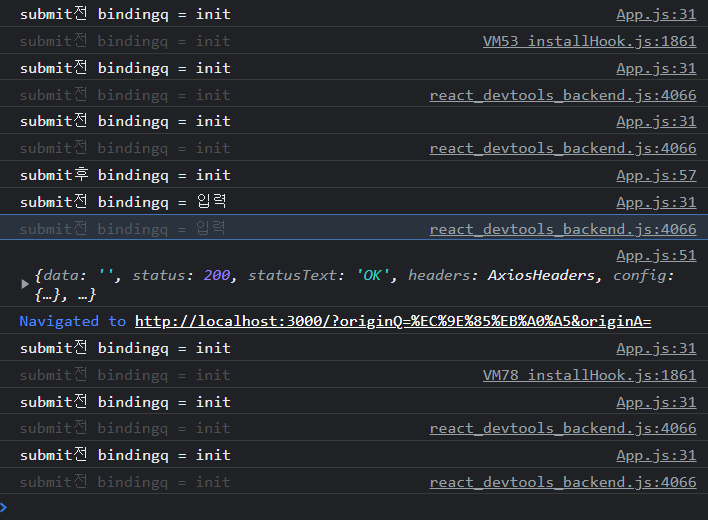 그렇게 고민하던 때에 콘솔창을 보고 든 생각이 '페이지가 url을 다시불러오네? 새로고침되는건가?'였고 바로 컴포넌트에