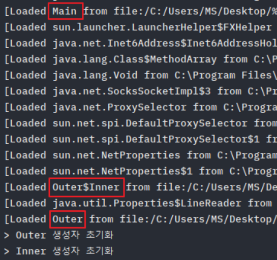 Outer() { System.out.println("> Outer 생성자 초기화"); }