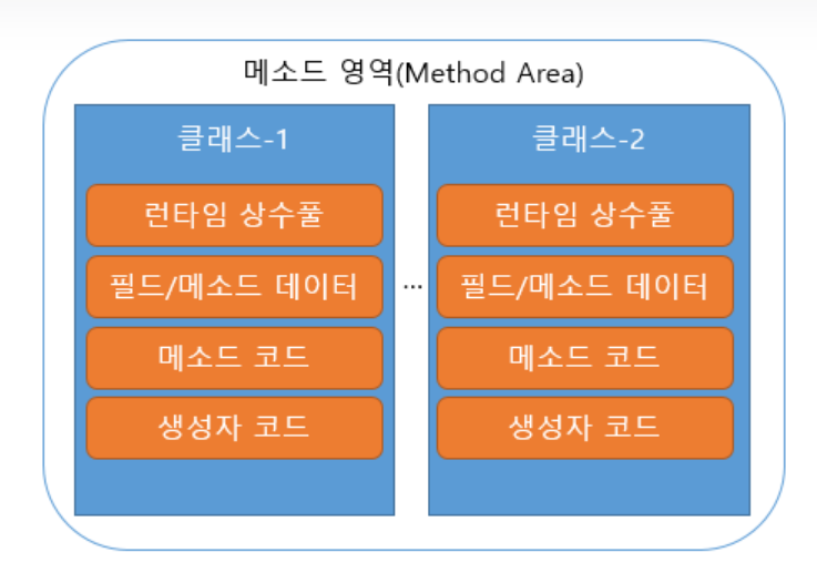 Method Area는 MetaSpace라고도 불리지만 일부에선 Class Area, Static Area로도 불립니다. 이름처럼 이곳엔 클래스와 인터페이스의 타입 정보, 그 메서드, 필드의 정보와 런타임 상수 풀 등을 보관합니다. 한마디로 static 필드는 다 이곳에 보관되는 거죠. 우리가 이전 포스트에서 메모리가 사용될 때 DATA 영역에 static이 저장된다고 들었을텐데 JVM에서 쓰는 명칭은 살짝 다른거죠. 한마디로 우리가 학습할 때 Method Area, DATA Area, Class Area, Static Area는 모두 같은 개념이라고 생각하시면 편합니다. 인스턴스와 객체는 분명 다른 개념이지만 자바를 배울땐 혼용해서 칭하는 것과 비슷하겠죠?