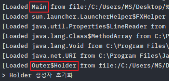 위와 같이 Outer는 인스턴스화되지 않고 오직 Holder만 인스턴스화되는 것을 볼 수 있습니다.