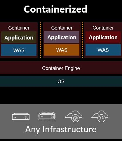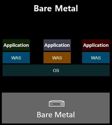 위와 같은 문제점을 해결하기 위해 가상화(Virtualized) 기술이 도입됩니다. 아래 그림처럼 기존에는 하나의 물리 하드웨어 위에 하나의 OS가 설치되고 그 위에 여러 WAS가 실행되었습니다. 이 과정에서 아까의 예시처럼 하나의 WAS에 과도한 자원이 몰리면 다른 WAS에 영향이 가는 것이 불가피하며 하나의 OS에서 여러 WAS가 동작하므로 호환이 되지 않는 WAS는 사용하지 못하거나 다른 OS를 설치한 또다른 하드웨어를 추가로 구축해야 했습니다.